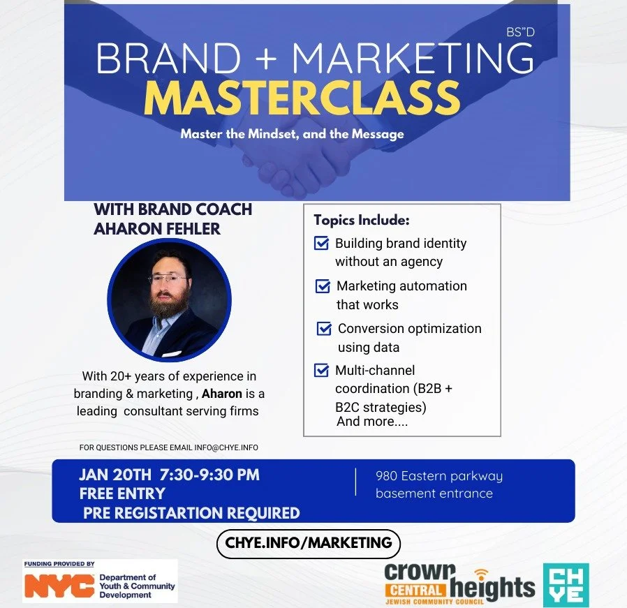 Join us for a practical, results-driven Brand + Marketing Masterclass led by brand coach Aharon Fehler, a seasoned consultant with over 20 years of experience helping businesses clarify their message and grow with confidence. Designed for entrepreneurs, business owners, and professionals, this session will cover how to build a strong brand without an agency, use marketing automation that actually works, optimize conversions through data, and coordinate marketing across B2B and B2C channels. You’ll leave with clear direction, actionable strategies, and tools you can apply right away.